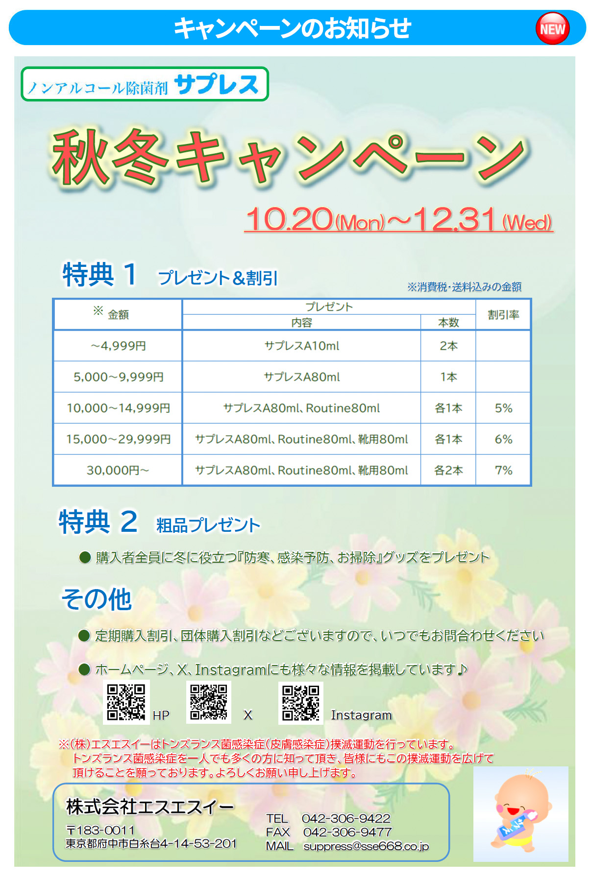 インフルエンザ・ノロウィルスの季節がそこまで来ています。 学校、介護施設、公共施設、もちろん自分たちの対策は万全ですか? さあ!サプレスで感染症にかかる前の早めの対策を! 対策はサプレスA。皆様のお役に立ちますよ。 サプレスは細菌、真菌(カビ菌)、藻類合わせて704菌種に効果。 サプレスは(株)予防医学推進センターでノロウィルス対応試験も実施。 サプレスはノロウィルスにも抜群の効果があると証明されました。 インフルエンザ、ノロウィルス対策には是非効果抜群のサプレスを! ”何事も感染する前の予防が一番大切です” 今すぐお電話を。エスエスイ―は皆様に「安全・安心」をお届けします。 株式会社エスエスイー 電話 042-306-9422 FAX 042-306-9477 お問合せフォームはこちら |