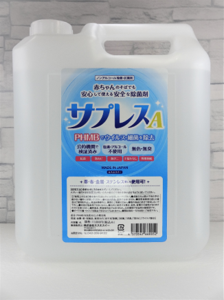 サプレスA(業務用)【4L】 サプレスA(業務用)【4L】 サプレスは安全性が高く、人の健康、地球環境を考えた、どなたにでも安心して使える本当の意味でやさしい、ノンアルコールの除菌剤です。 スポーツウェア、靴、赤ちゃんの洋服やおもちゃ、絨毯、ソファーなど様々な用途でご利用頂けます。 家庭内・学校・公共施設・レストラン・銭湯・食品業・サウナ・ゴルフ場・公園・ペットショップ・ごみ集積場・畜産業等 12,540円(送料税込) ¥12,540 (送料・税込) サプレスA(業務用)【4L】個 お買い物カゴに追加